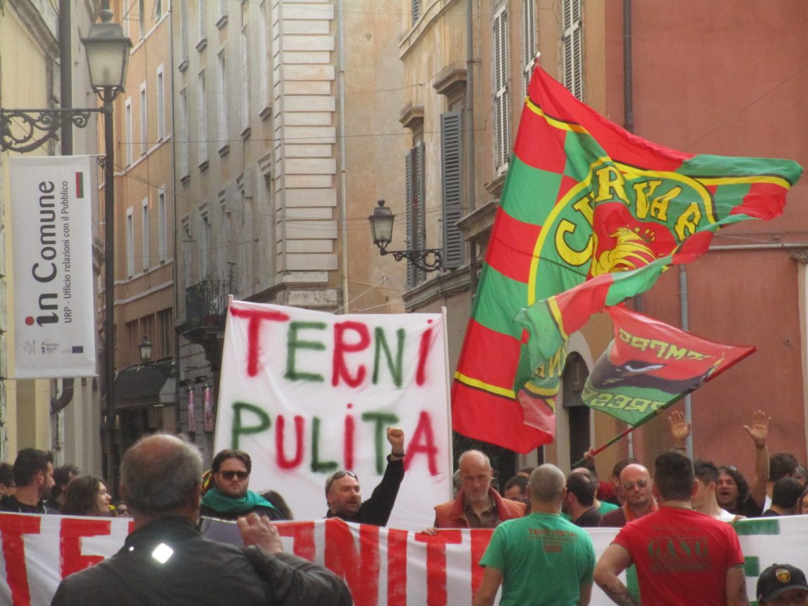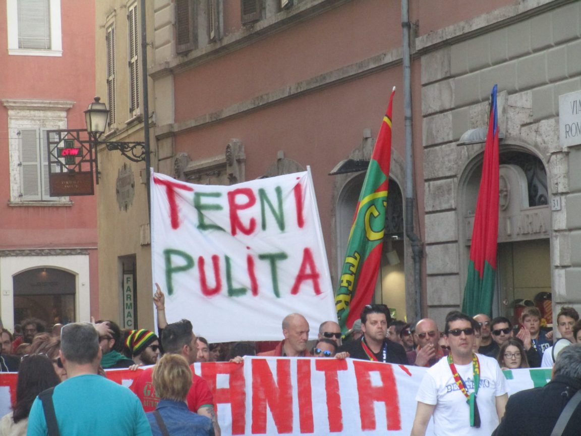 Si è svolto nel pomeriggio odierno il corteo Curva Est Ternana No Inceneritori. I gruppi organizzati del settore citato hanno dato appuntamento al Foro Boario. Successivamente si sono diretti verso il centro dove era programmata la grande manifestazione di piazza che, ha coinvolto, migliaia di persone. I tifosi della Ternana, da via Roma sono confluiti nel lungo corteo proveniente da corso Tacito. Striscioni e cori di contestazione nei confronti della proprietà e delle istituzioni prima di intervenire al comizio.