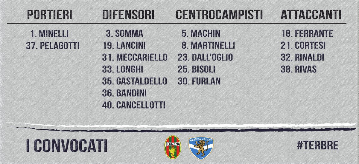Cinque assenze per il Brescia alla vigilia della prosecuzione della sfida alla Ternana. A Coppolaro, Checchin e Torregrossa si aggiungono Caracciolo e Ndoj. Entrambi i calciatori, ultimi citati, avevano accusato dei problemi fisici durante il match contro il Perugia. Si tratta di assenze pesanti in vista della gara del Liberati. Il capitano aveva realizzato la rete del pareggio subentrato in corsa. Inoltre il centrocampista è uno dei punti fermi della mediana di Boscaglia. Infine, da ricordare che Gastaldello tornerà a disposizione dopo il turno di squalifica. I convocati come riporta il profilo twitter ufficiale: