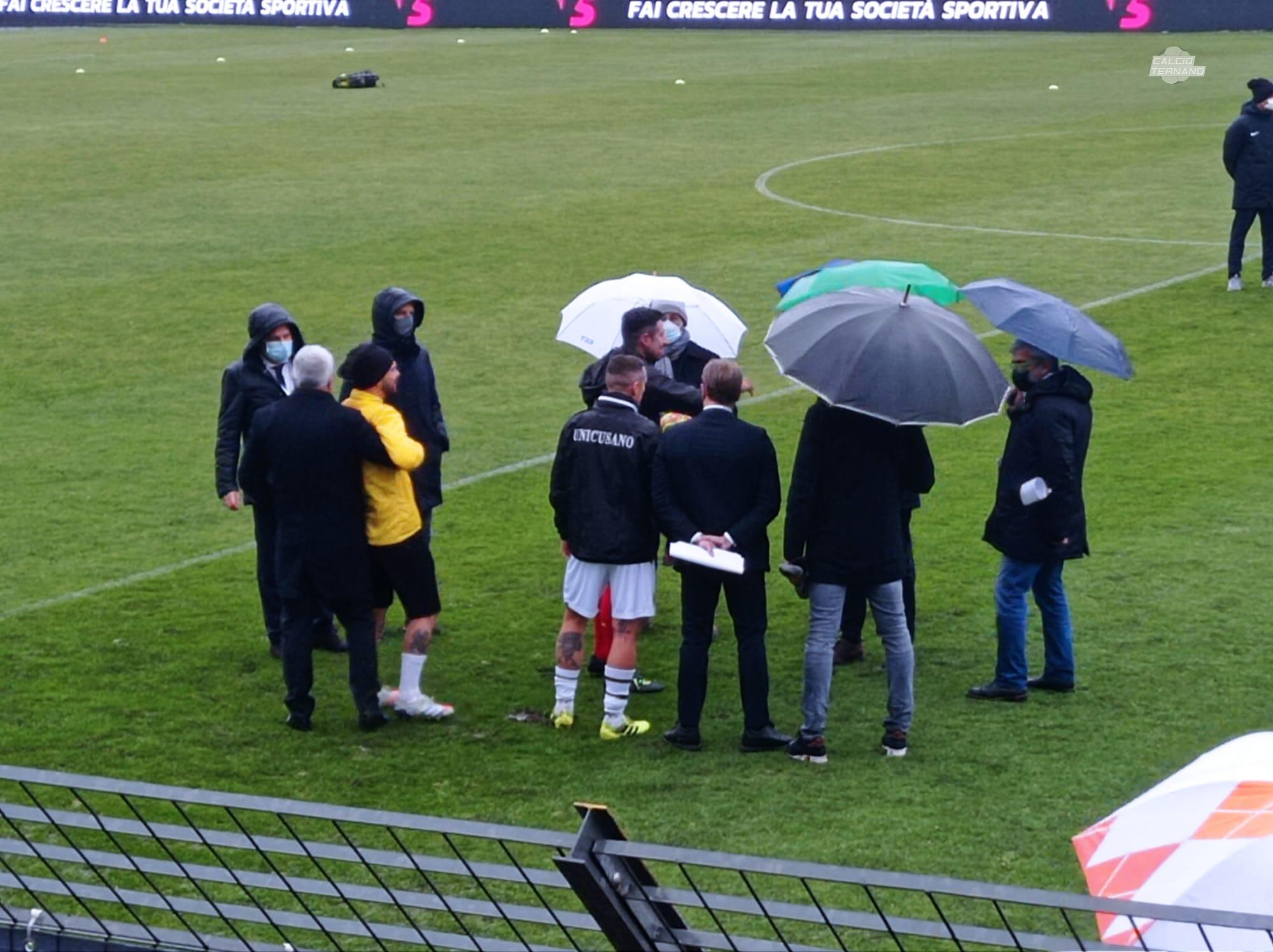 La partita è a rischio per le condizioni del campo dell'Enrico Rocchi. Nella foto scattata alle 14,10 il sopralluogo del signor D'Ascanio alla presenza degli assistenti, capitani e dei componenti delle rispettive società