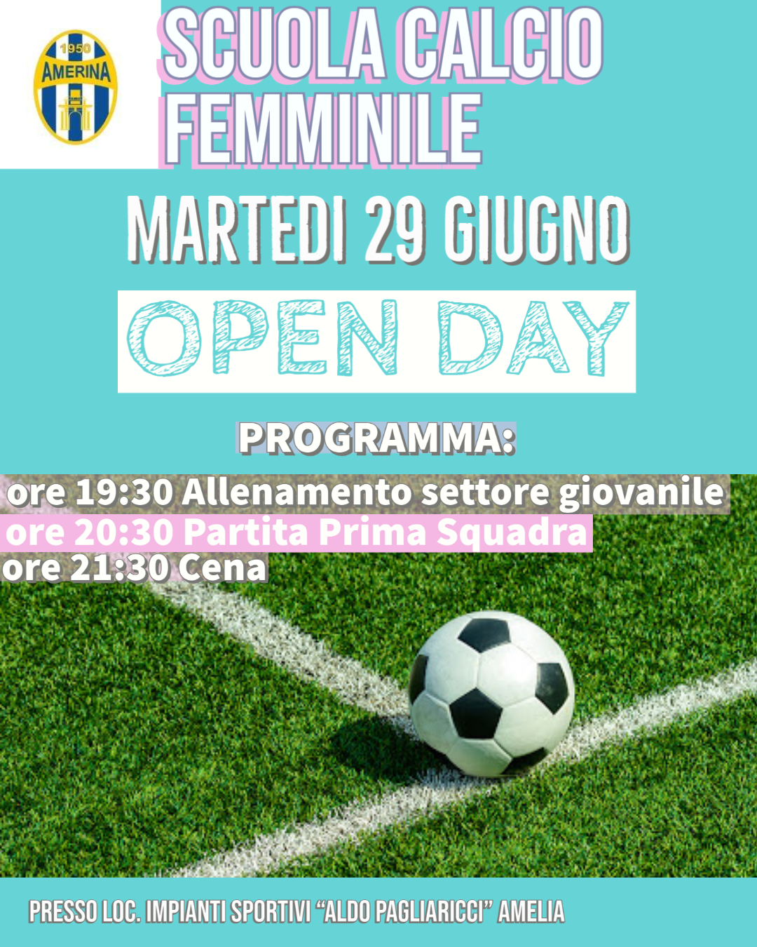 E' partita ufficialmente l'avventura dell'Amerina nel calcio femminile. Il direttore sportivo Cristiano Turchi, nella trasmissione "Passione Dilettanti", ci aveva parlato di questo nuovo progetto. Adesso il club del presidente Dino Scaia, per la giornata del 29 giugno, ha indetto un 'Open Day'. Alle ore 19:30 è previsto un allenamento della scuola calcio femminile, successivamente ci sarà una partita delle ragazze più grandi - allenate da Vincenzo Conti - che faranno parte della prima squadra la quale parteciperà al prossimo campionato di Eccellenza. In ultimo la serata si concluderà con una cena in famiglia offerta dalla società Amerina.