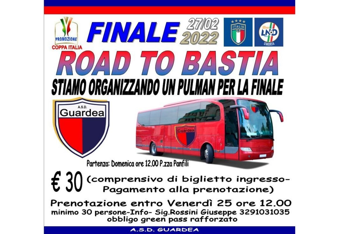 Uno splendido percorso culminato con la finalissima di Coppa Promozione. Il Guardea si accinge a sfidare il Ventinella, domenica 27 febbraio, nella gara che vale il prestigioso trofeo. Per la circostanza la società rossoblù sta allestendo un bus per consentire ai tifosi di seguire i ragazzi di mister Avola allo stadio 'Carlo Degli Esposti' di Bastia. Come viene spiegato nel post descrittivo il costo è di 30 euro, tagliando compreso. Possibile prenotare entro la giornata di venerdì 25 febbraio ore 12.