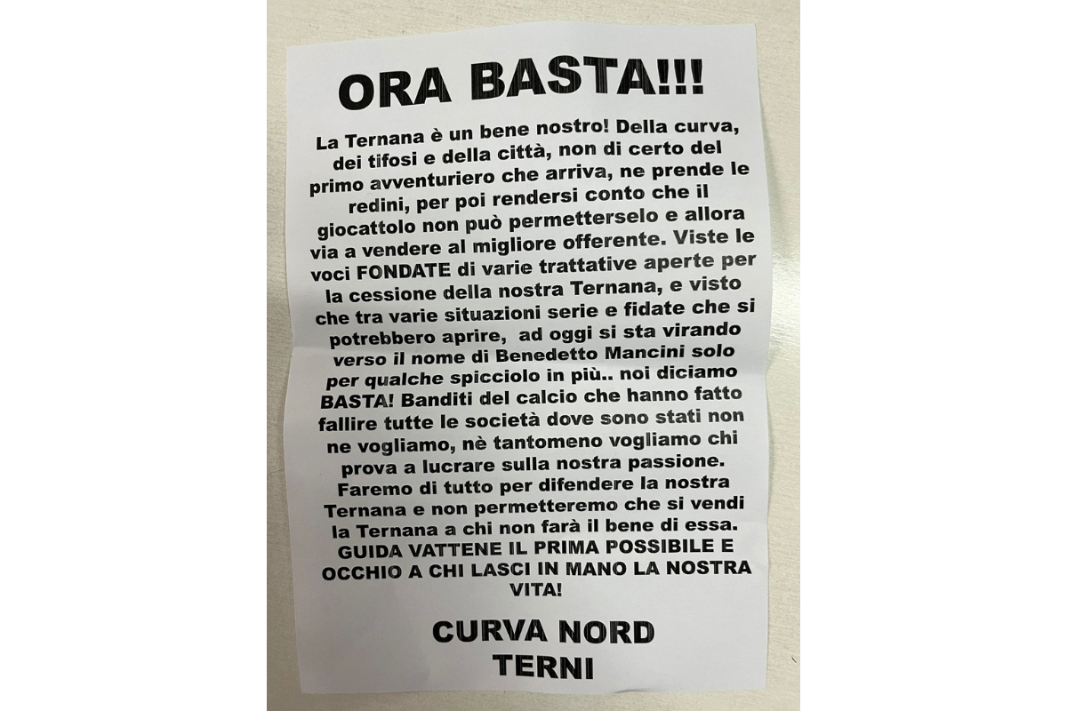 Viste le voci FONDATE di varie trattative aperte per la cessione della nostra Ternana, e visto che tra varie situazioni serie e fidate che si potrebbero aprire, ad oggi si sta virando verso il nome di Benedetto Mancini solo per qualche spicciolo in più. Noi Diciamo BASTA! Banditi del calcio che hanno fatto fallire le società dove sono stati non ne vogliamo, ne tantomeno vogliamo chi prova a lucrare sulla nostra passione. Faremo di tutto per difendere la nostra Ternana e non permetteremo che si vendi a chi non farà il bene di essa. Guida vattene il prima possibile e occhio a chi lasci in mano la nostra vita!"