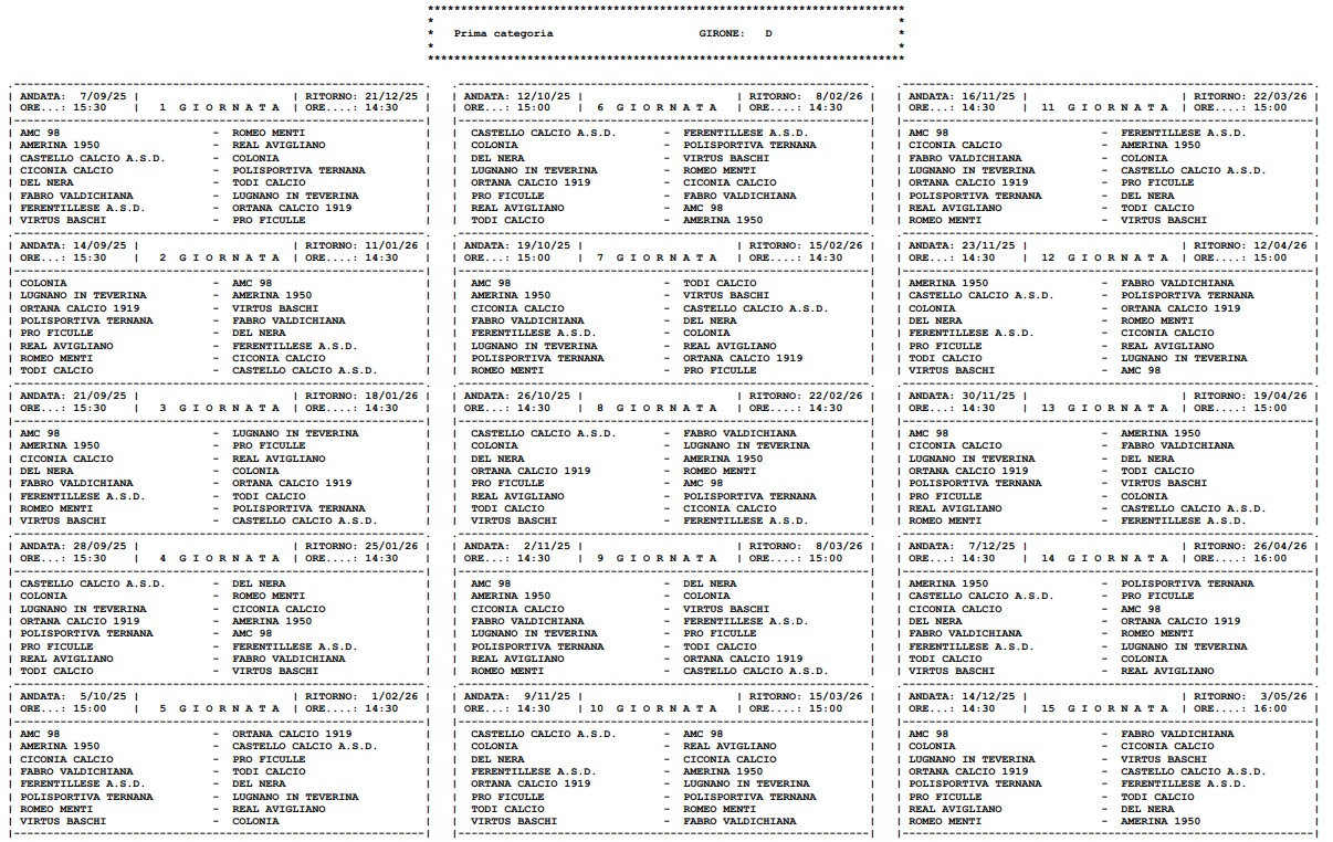 Presentato il calendario di Prima categoria girone D. Sono sedici formazioni ternane tranne il Todi che è stato inserito nel raggruppamento. Di seguito tutte le giornate: